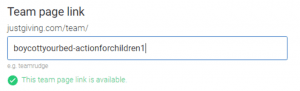 ‘Team page link’ – Input your Team page link using the format BoycottyourBed2021-Companyname. For example: