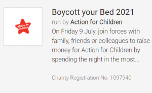 If you found out about Boycott your Bed through an Action for Children campaign or communication, social media, are a member of staff, an existing supporter, please use the link below to set up your fundraising page: